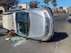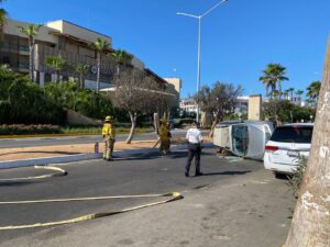 SAN JOSE DEL CABO, BCS.-A las 8:30 de mañana de este domingo, el personal del Departamento de Bomberos de San José del Cabo de la Estación #1 Centro, atendió el reporte de un accidente automovilístico tipo volcadura con 3 vehículos involucrados, sobre la zona hotelera, como referencia, frente al desarrollo Vidanta.