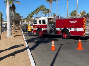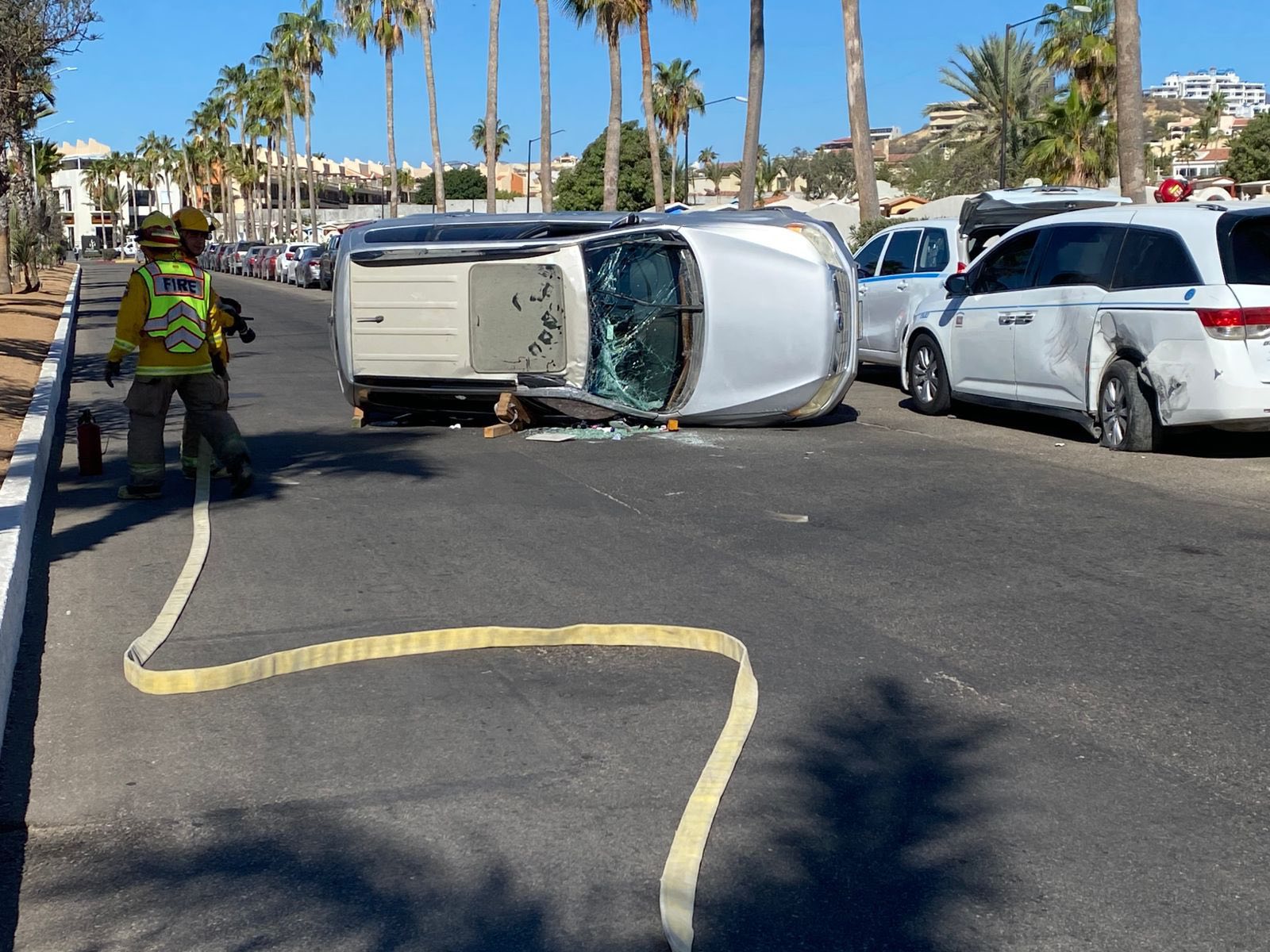 SAN JOSE DEL CABO, BCS.-A las 8:30 de mañana de este domingo, el personal del Departamento de Bomberos de San José del Cabo de la Estación #1 Centro, atendió el reporte de un accidente automovilístico tipo volcadura con 3 vehículos involucrados, sobre la zona hotelera, como referencia, frente al desarrollo Vidanta.