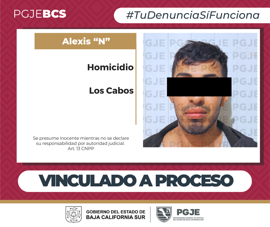 En la continuación de audiencia inicial por orden de aprehensión que se efectuó el martes 2 de diciembre del año en curso en el Centro de Justicia Penal de Cabo San Lucas, Alexis Armando “N”, quedó formalmente vinculado a proceso y permanecerá en prisión el tiempo que dure dicho proceso, imputado por el delito de homicidio calificado con ventaja en agravio de una persona del sexo masculino.