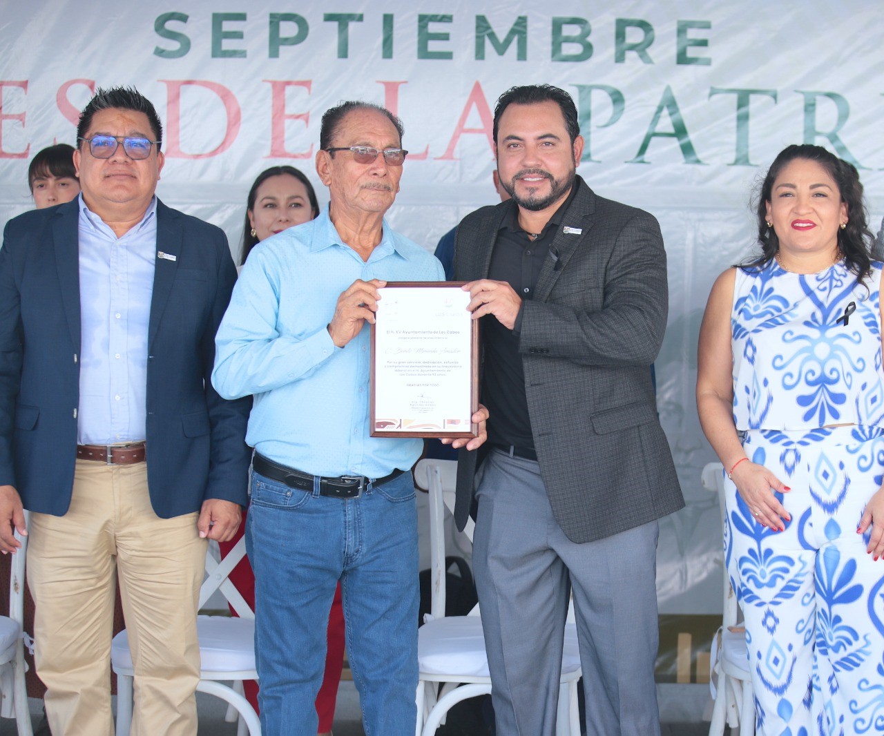 Finalmente, el alcalde Christian Agúndez, acompañado de integrantes del Cabildo y titulares de diferentes dependencias municipales, hizo entrega de un reconocimiento al ciudadano Benito Miranda Castro, por más de 4 décadas en la función pública.