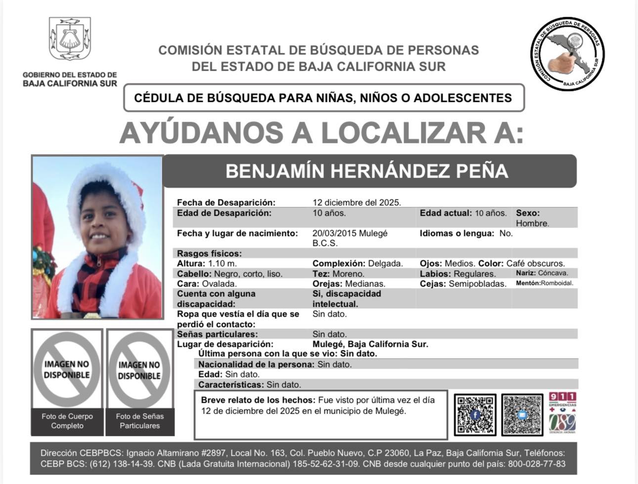 Y, el martes 23 de diciembre, la Comisión Estatal de búsqueda de Personas Desaparecidas, dio a conocer que también era buscado Miguel Ángel Peña Hernández, de 10 años de edad, quien fue reportado como desaparecido el 12 de diciembre.