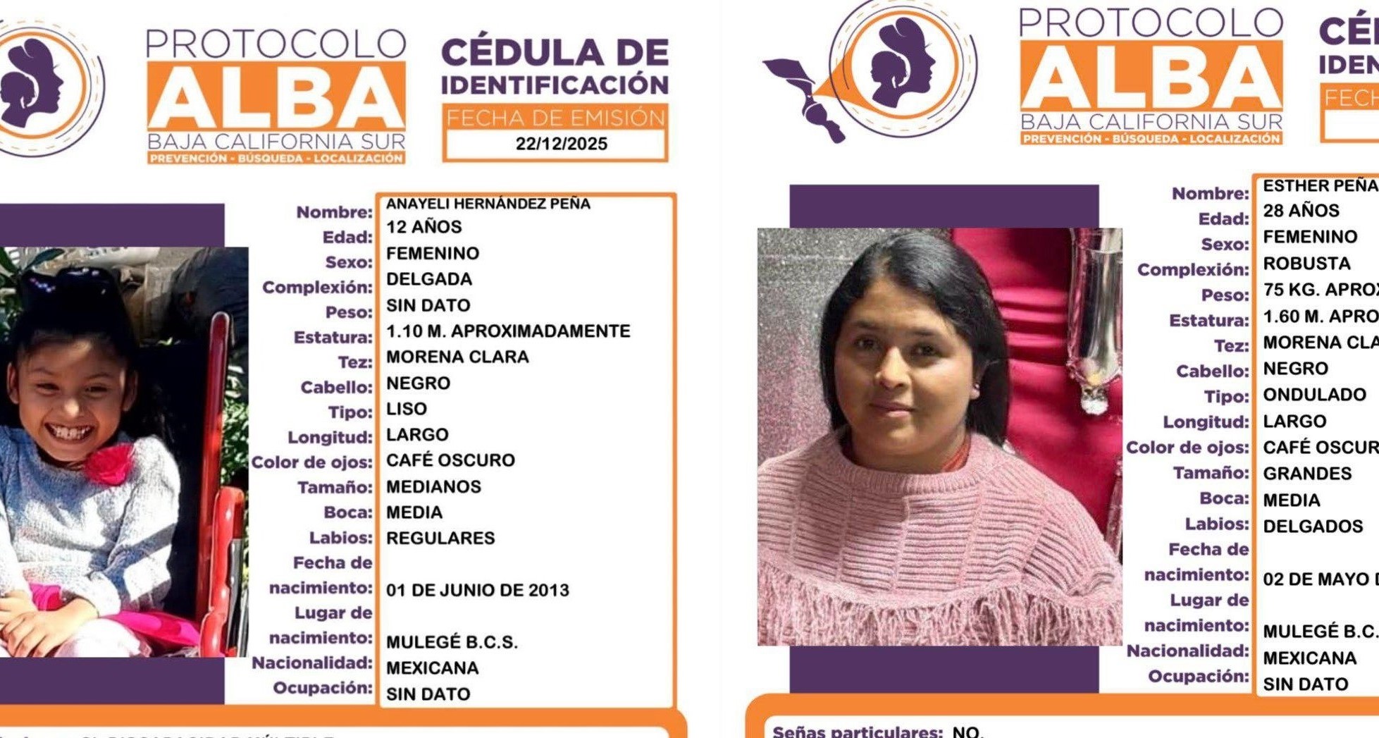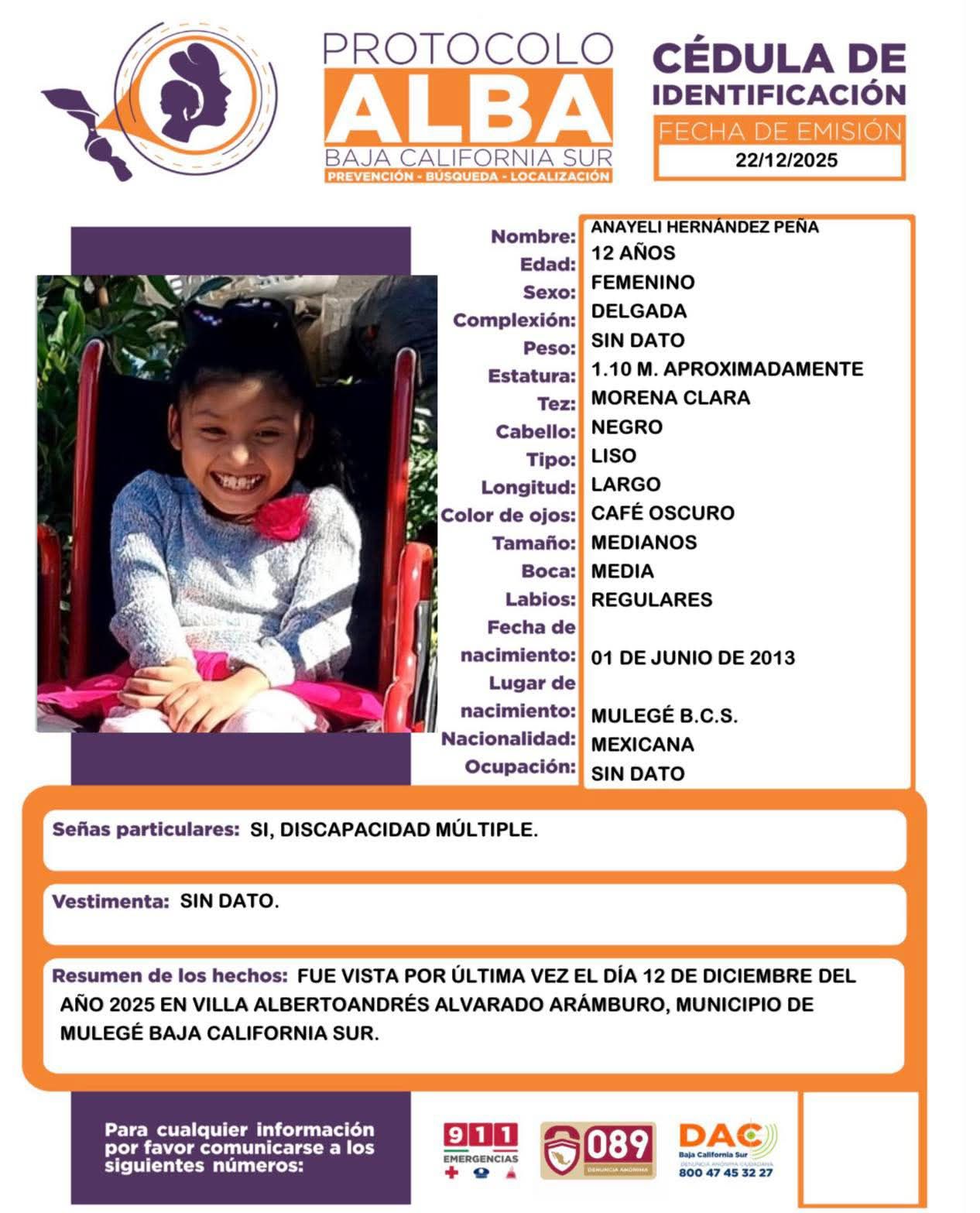 Con fecha de 22 de diciembre, la Procuraduría de Justicia de Baja California Sur, activo la alerta ALBA, para la búsqueda inmediata, de Nayeli Hernández Peña, de 12 años de edad.