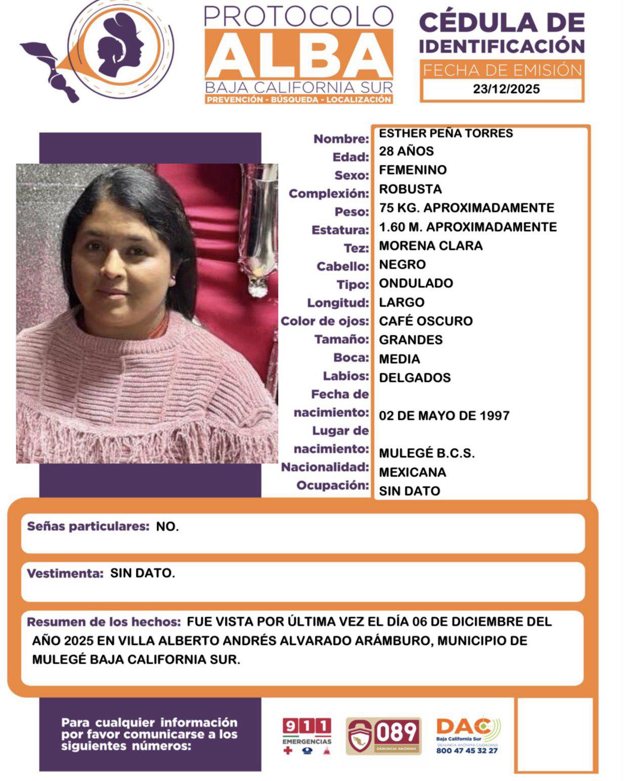Incluso, el 23 de diciembre, la Procuraduría de Justicia del Estado de Baja California Sur, informo sobre la desaparición Esther Peña Torres, de 28 años de edad.