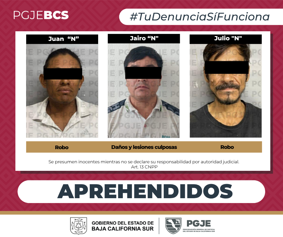 Agentes de Investigación de la Procuraduría General de Justicia del Estado (PGJE), de Baja California Sur, realizaron operativos para aprehender a 3 personas del sexo masculino, por delitos de robo, daños y lesiones.