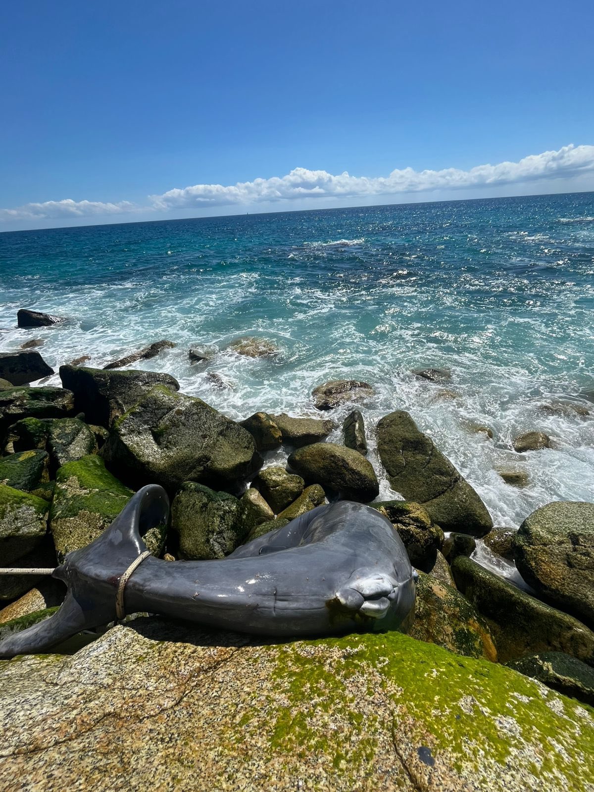 Cabo San Lucas, BCS. -A lo lejos, se escucha el llanto de una ballena, pero entre las rocas, fue encontrado sin vida, su ballenato, que falleció.