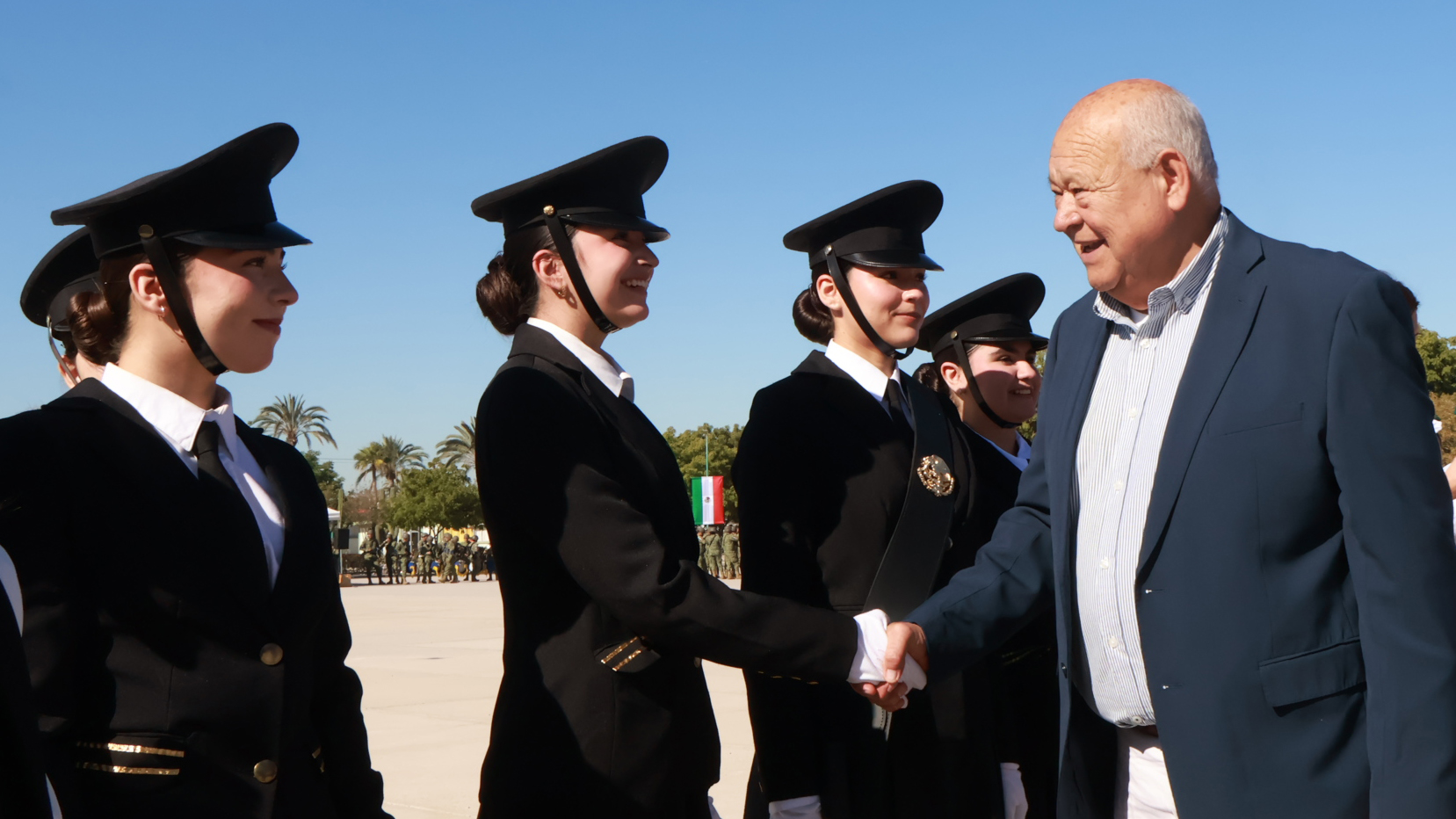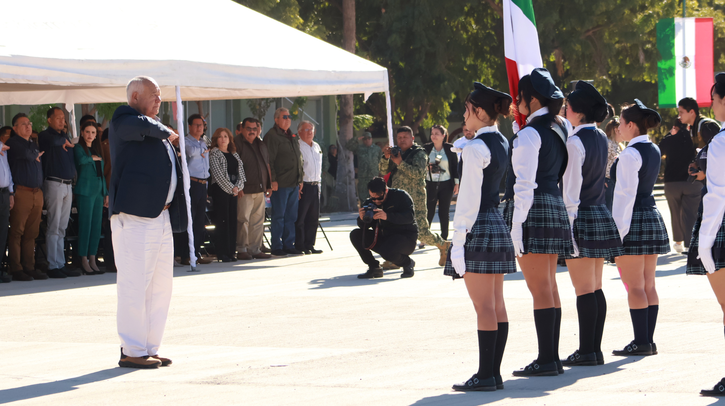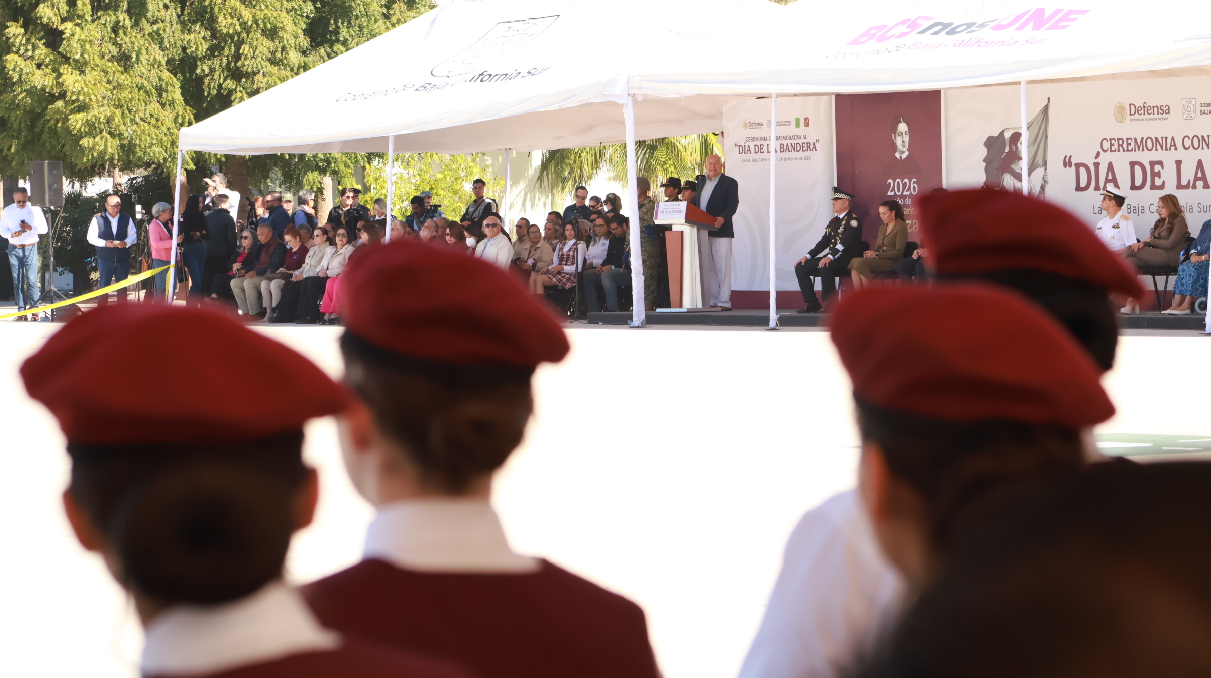 El gobernador del estado, Víctor Manuel Castro Cosío, encabezó la ceremonia alusiva al Día de la Bandera en las instalaciones de la Tercera Zona Militar, acompañado por mandos de las Fuerzas Armadas, representantes de los poderes Legislativo y Judicial, así como por la presidenta municipal de La Paz, Milena Quiroga Romero, además de estudiantes de distintos planteles educativos.