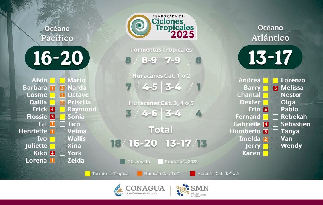 Los Cabos, Baja California Sur.- El XV Ayuntamiento de Los Cabos, informa que este domingo 30 de noviembre, concluye oficialmente la Temporada de Huracanes 2025 para el océano Pacífico, con un balance positivo para el municipio y en general para Baja California Sur. El director municipal de Protección Civil, Francisco Cota Márquez, explicó que la temporada, aunque desafiante, permitió la recarga de mantos freáticos y benefició al sector agrícola y ganadero debido a las precipitaciones importantes registradas en la región.