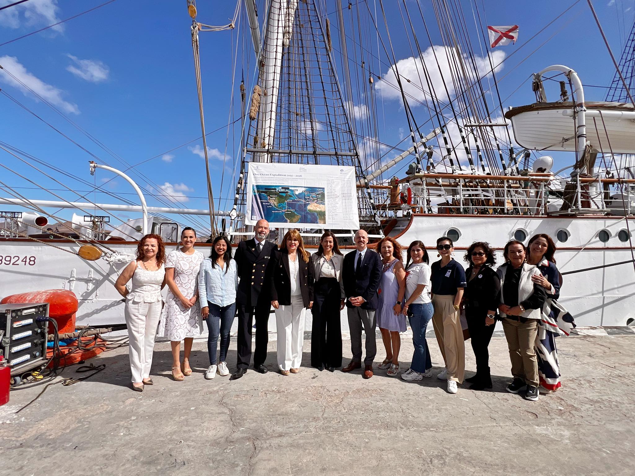 La secretaria de Turismo y Economía, Maribel Collins Sánchez, estuvo presente en la recepción oficial del velero noruego Statsraad Lehmkuhl, que arribó al Puerto de La Paz como parte de la One Ocean Expedition, un recorrido global de un año en el marco del Decenio de las Ciencias Oceánicas de la ONU.
